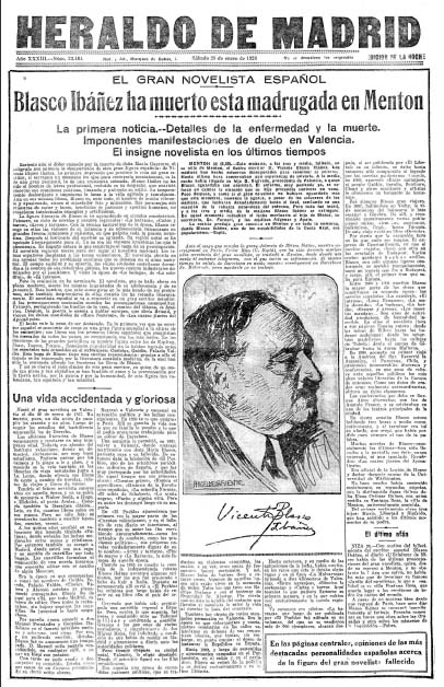La muerte de Blasco Ibáñez, en 1928, fue tratada como un gran acontecimiento por Heraldo de Madrid, que sin duda jugó también a la lectura política, pues el escritor era un figura del movimiento republicano español y en el momento de su muerte llevaba exiliado unos cuantos años en profundo desacuerdo con la dictadura de Primo de Rivera.