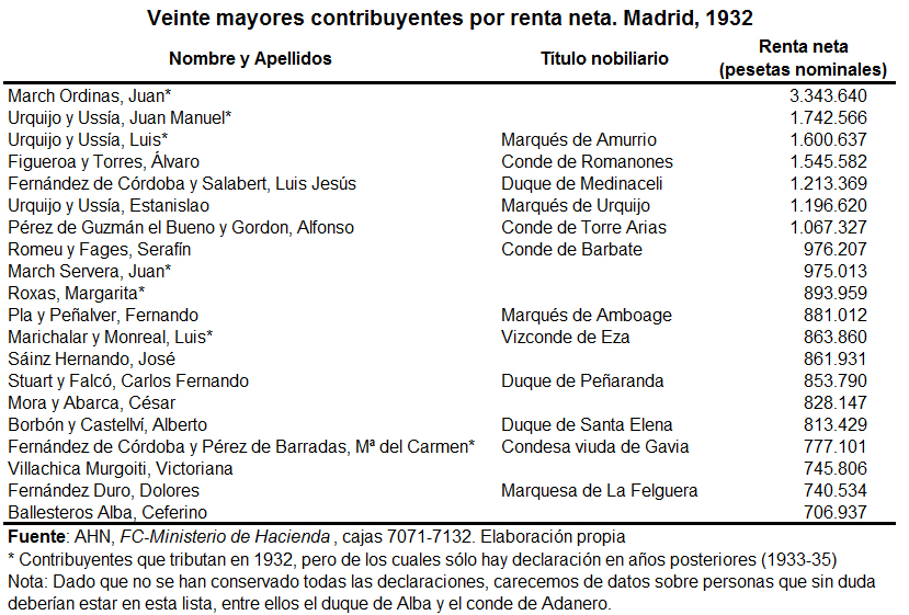 Como fuente histórica, la Contribución general sobre la Renta tiene el indudable valor de haber reunido miles de declaraciones de contribuyentes, de forma que el historiador puede conocer la composición de sus patrimonios, quiénes eran los mayores terratenientes del país o cuánto cobraban los consejeros de las grandes empresas. La lista de mayores contribuyentes que he elaborado tras consultar los expedientes de Madrid reúne nombres muy conocidos en la época, pero también a personas que hacían gala de una extraordinaria discreción. Entre los primeros se encontraba Juan March (el hombre más rico del país), los tres hermanos Urquijo (banqueros), el conde de Romanones o el vizconde de Eza (ministros durante la Restauración) y las familias más prestigiosas de la vieja aristocracia, como el duque de Medinaceli, el conde de Torre Arias o el duque de Peñaranda. A cambio, el lector posiblemente desconozca a Margarita Roxas, viuda de uno de los mayores comerciantes de Filipinas, o a José Sáinz Hernando, que dirigía un banco familiar especializado en el envío de remesas y en las operaciones bursátiles.