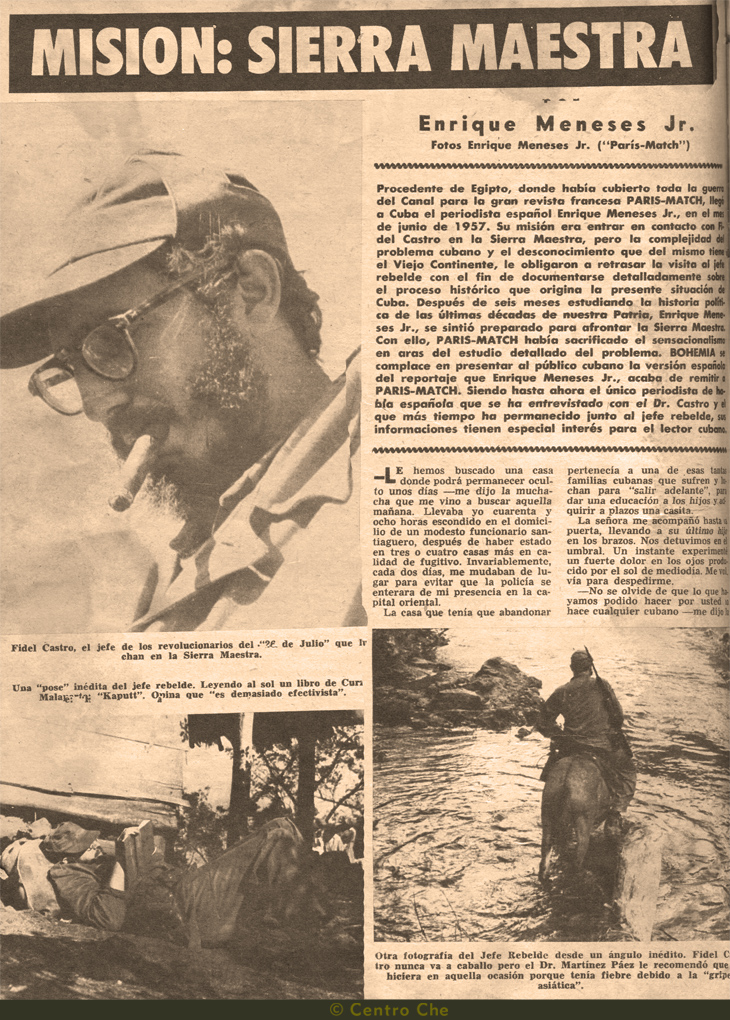 La Revolución Cubana a día de hoy sigue generando simpatías y animadversiones a partes iguales según el filtro por el que se mire. Pero si volvemos la vista al origen, esta retrospección nos lleva inmediatamente al romántico entorno de Sierra Maestra, con hombres embutidos en uniformes verde-oliva, con un habano colgando de los labios y un fusil en la mano. Se puede afirmar que la responsabilidad de la forja de esta imagen recae exclusivamente en los medios de comunicación, que a finales de la década de los cincuenta del siglo XX se encargaron de que las instantáneas de los guerrilleros cubanos dieran la vuelta al mundo. Y en esta amplia difusión tuvo mucho que decir el trabajo del fotoperiodista español Enrique Meneses, que viajó a las montañas orientales de Cuba a finales del año 1957 para lograr un amplio reportaje publicado por el semanario francés Paris-Match en la primavera de 1958.