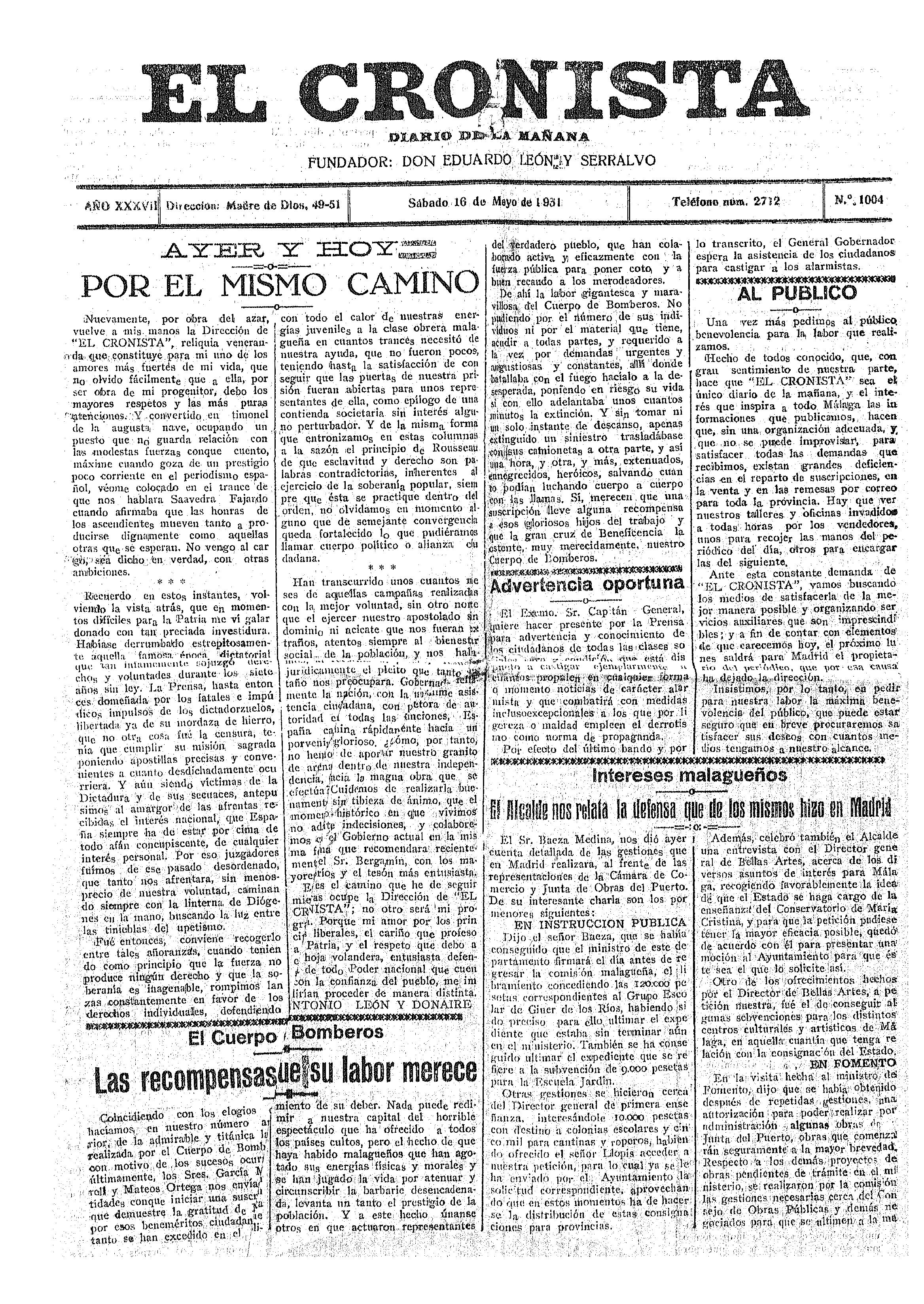 Dos trayectorias personales que se cruzan un 19 de julio de 1936, fecha en la que se produce la incautación de El Cronista, y que dan pie para el estudio de la profunda brecha ideológica entre los periodistas malagueños de la época. Más tarde, en 1937, a través de la denuncia del hijo de Eduardo León y Serralvo se dibuja un escenario completamente diferente al estar la ciudad bajo mando franquista, y la represión se ha institucionalizado.