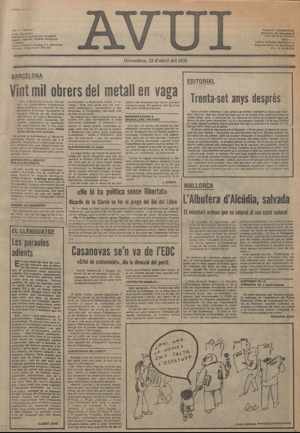 | Portada del primer número del diari ‘Avui’, publicat el dia de Sant Jordi del 1976. |
